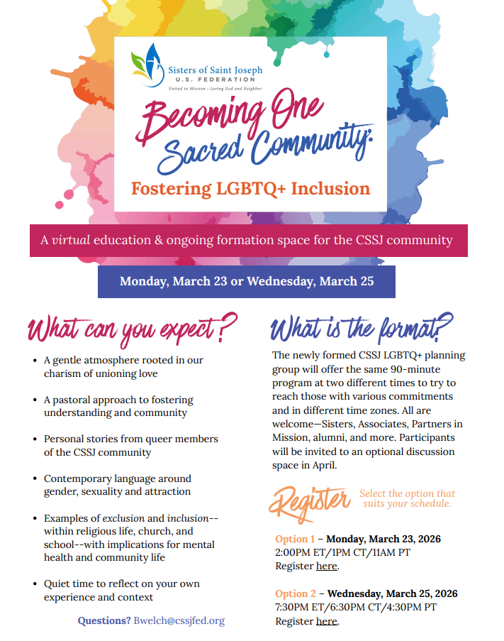 The Sisters of St. Joseph are excited to offer a virtual education and ongoing formation space to deepen our shared understanding of how to foster LGBTQ+ inclusion. Entitled "Becoming One Sacred Community," this 90-minute program will be offered at two different times in March.
